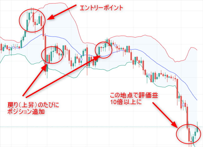 ゴールドCFD相場で天井狙いのショート戦略がはまり、評価益が10倍まで伸びたので、ロスカットと部分利確、建玉管理のポイントを整理しておきます。3月2日前後を天井と判断し、それまでは何度かロスカットを受けながらも打診ショートを継続しました。相場観が大きくは外れていないと考え、3月2日に再度ショートで打診エントリーしたところ、これがうまくささり、その後の戻り局面でロットを少し増やして追加ショートを実施。結果として評価益が一気に10倍まで増えました。