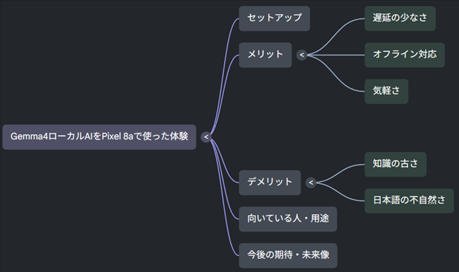 現時点では、誰にでも絶対におすすめできる万能な環境とまでは言えませんが、「通信レスで動くAIの感触を一度確かめてみたい」「プライバシー重視でAIを試したい」といった方にとって、Gemma4をスマホで体験してみる価値は十分にあると感じました。まずはサブ用途として導入し、クラウドAIとの違いを比べてみるのがおすすめです。
